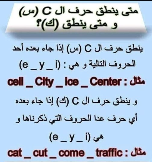 5- حرف C إذا أتى بعده E أو I أو Y يلفظ (S) أي مثل حرف السين: أمثلة: مدينة city – ثلج ice – دراجة bicycle