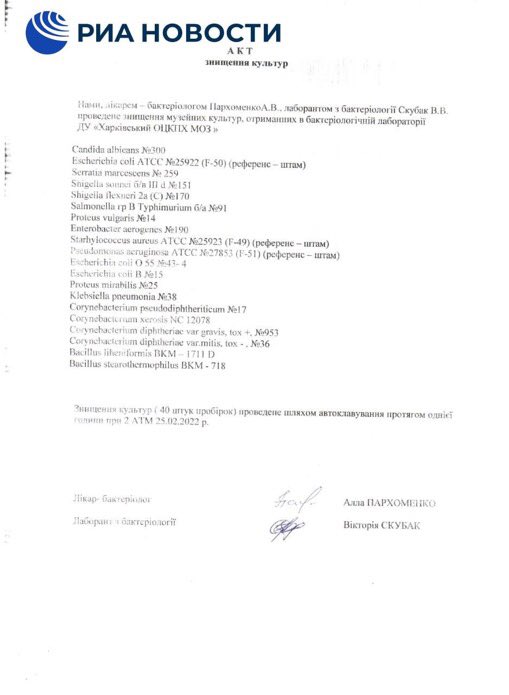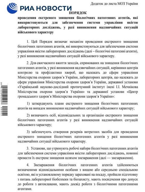 وتكشف الوثائق أن مختبرات أوكرانيا كانت تنتج الجمرة الخبيثة والطاعون وغيرها من الفيروسات وأن البنتاجون قد أصدر تعليمات بتدميرها