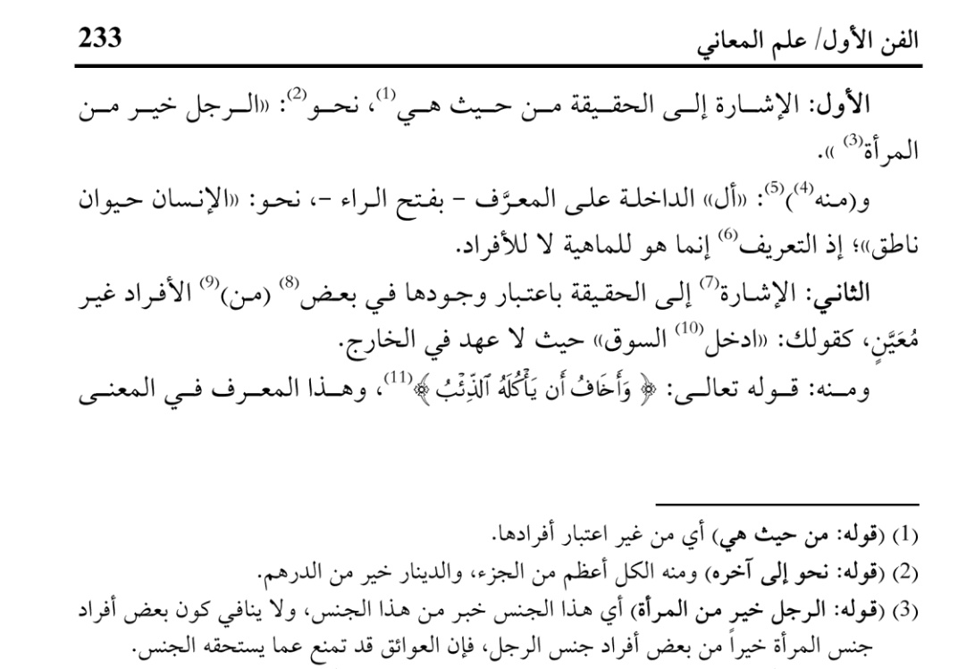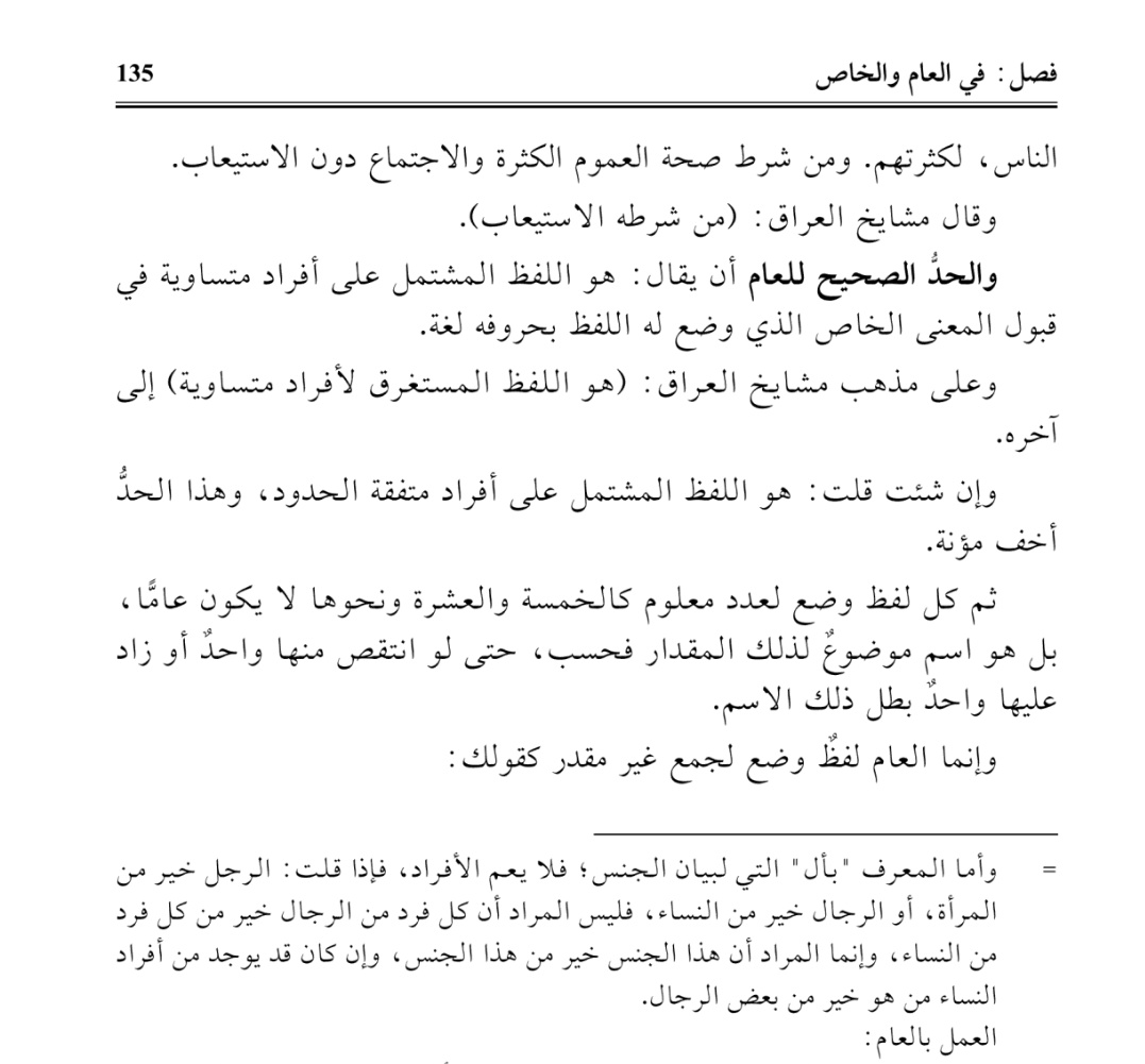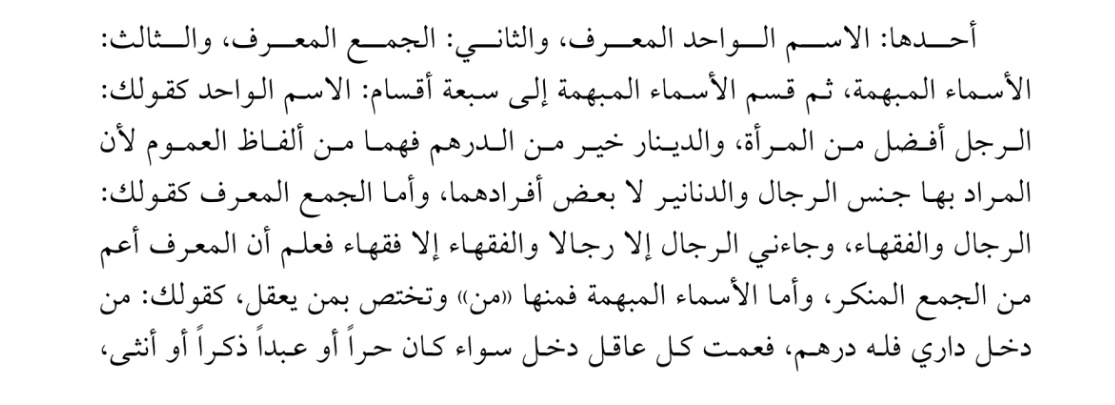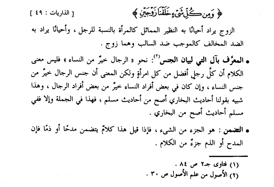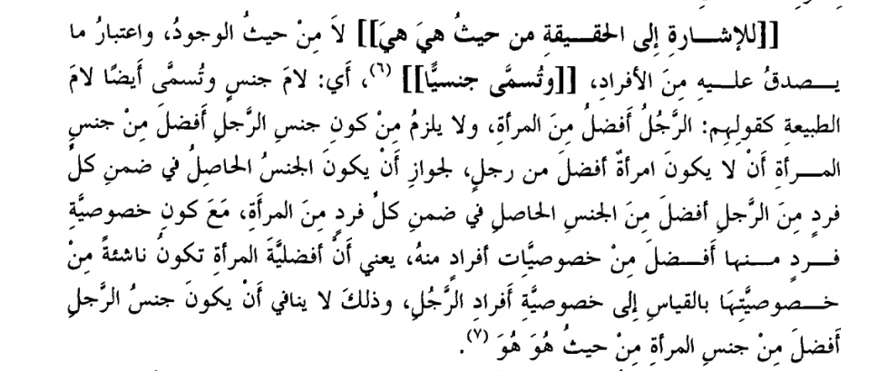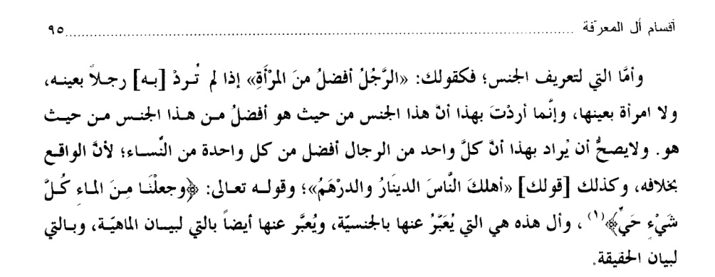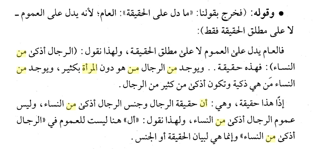 كقولك الرجل افضل من المرأة لم ترد به رجلاً بعينه ولا امرأة بعينها ولا يصح أن يراد بهذا أن كل واحد من الرجال أفضل من كل واحدة النساء لأن الواقع بخلافه