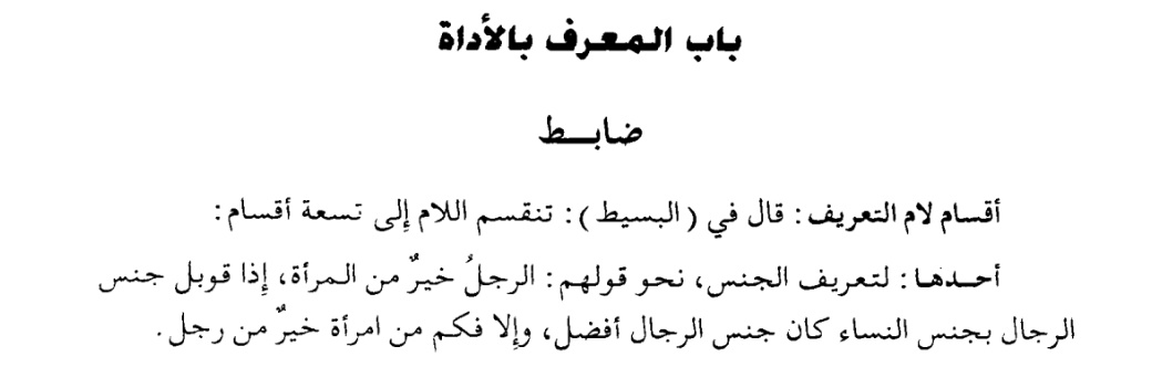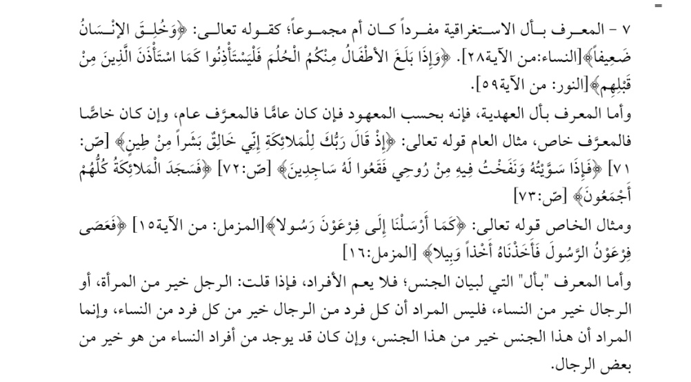 لبيان الجنس فلا يعم الأفراد فإذا قلت الرجل خير من المرأة أو الرجال خير من النساء فليس المراد أن كل فرد من الرجال خير من كل فرد من النساء ويوجد من أفراد النساء من هو خير من بعض الرجال