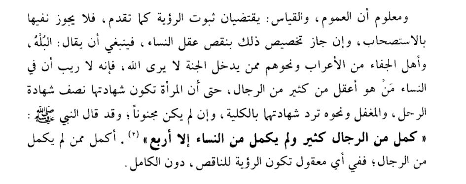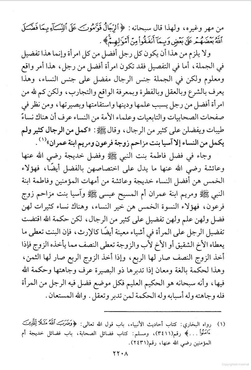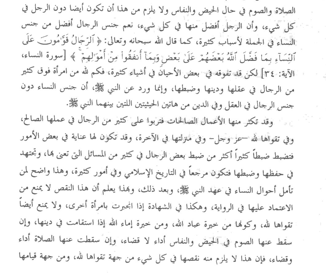 ولا يلزم أن تكون دون الرجل في كل شيء وأن الرجل أفضل منها في كل شيء فكم لله من امرأة فوق كثير من الرجال في عقلها ودينها وضبطها وقد تكثر منها الأعمال الصالحات فتربوا على كثير من الرجال وتضبط كثيراً من المسائل أكثر من ضبط بعض الرجال فتكون مرجعاً في أمور كثيرة