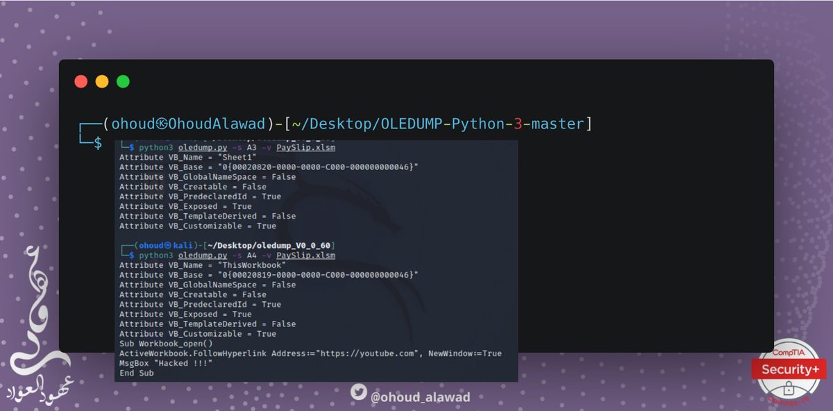 🔍 أداة التحليل oledump.py : هي أداة Python تستخدم لتحليل ملفات OLE2 (تنسيق ثنائي للملف المركب) ، يمكننا استخدامه لاستخراج كود الماكرو في المستند.