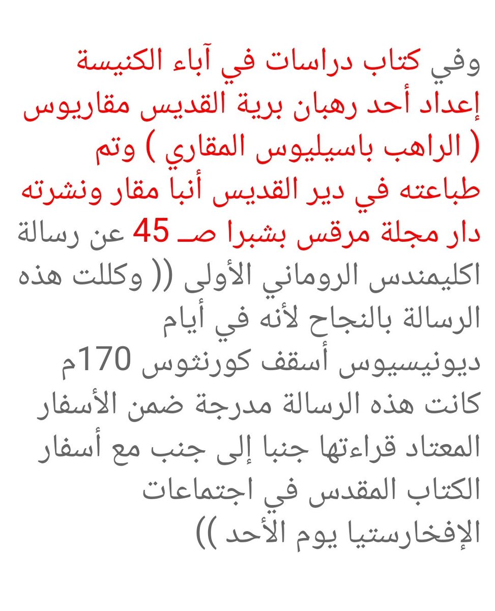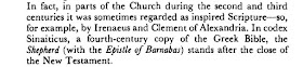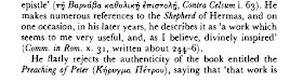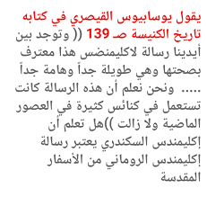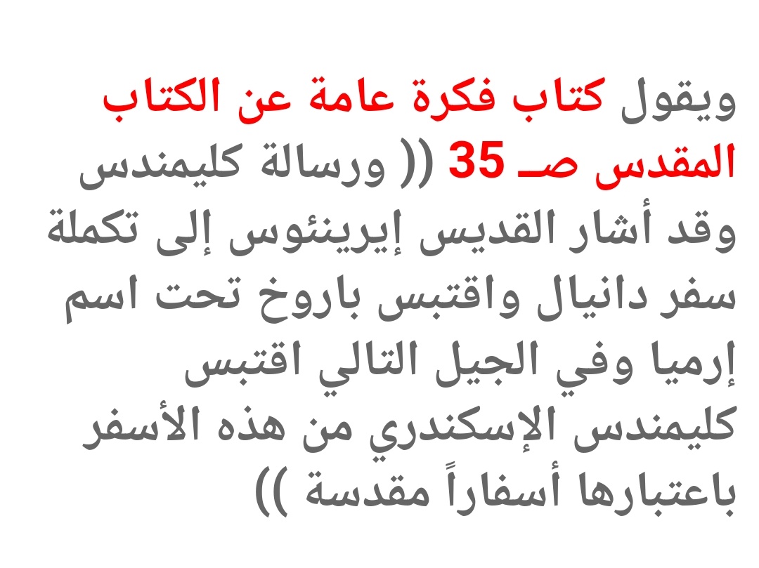 وأكليمنضس هذا كان يعتبر رسالة برنابا، ورؤيا بطرس (وهما سفران غير موجودان اليوم في الكتاب المقدس) كان يعتبرهما أسفاراً قانونية، يعني أسفاراً مقدسة.