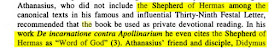 ومع أن أثناسيوس الرسولي لم يذكر الراعي لهرماس من ضمن قائمته المشهورة لأسفار العهد الجديد إلا أنه قد عبر عنها بكل احترام فقال عنها أنها نافعة وأنها كلمة الله في إحدى رسائله.