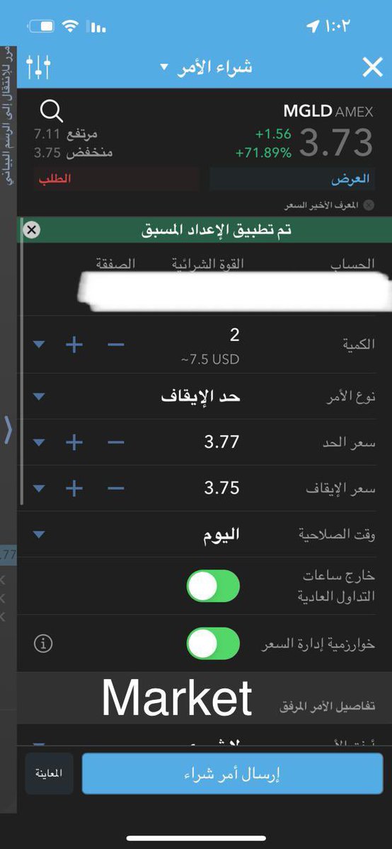 وتضع امر الشراء (سعر الحد) يتجاوز نقطة الاختراق بكم سنت مثلا 3.77 الى 3.80 دولار لضمان الدخول المبكر في حالة الصعود السريع ولو ماصعد سريع راح يشتري لك السيستم بأقل سعر مطروح بعد تجاوز النقطة