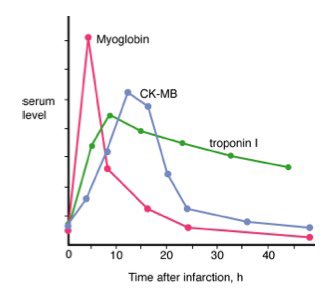 Myoglobin:an iron- and oxygen-binding protein ,found in skeletal and cardiac muscle (not specific).It respond very rapidly in case of cardiac muscle injury more than Tn and CK-MB.( sensitive).