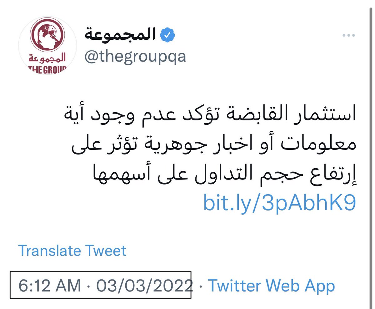 هيئة قطر مع تقديرنا لعملكم الكبير ولكن من اهم جوانب الاستثمار في الاوراق المالية الثقة، سواء في الاخبار أو التصاريح، اعتقد ما حدث من خلال هذه الشركة يحتاج دراسة منكم لوضع الية يمكن من خلالها حماية استثمارات الجميع وتشديد الرقابة على الشركات مع تمنياتي لكم بالتوفيق والسداد.