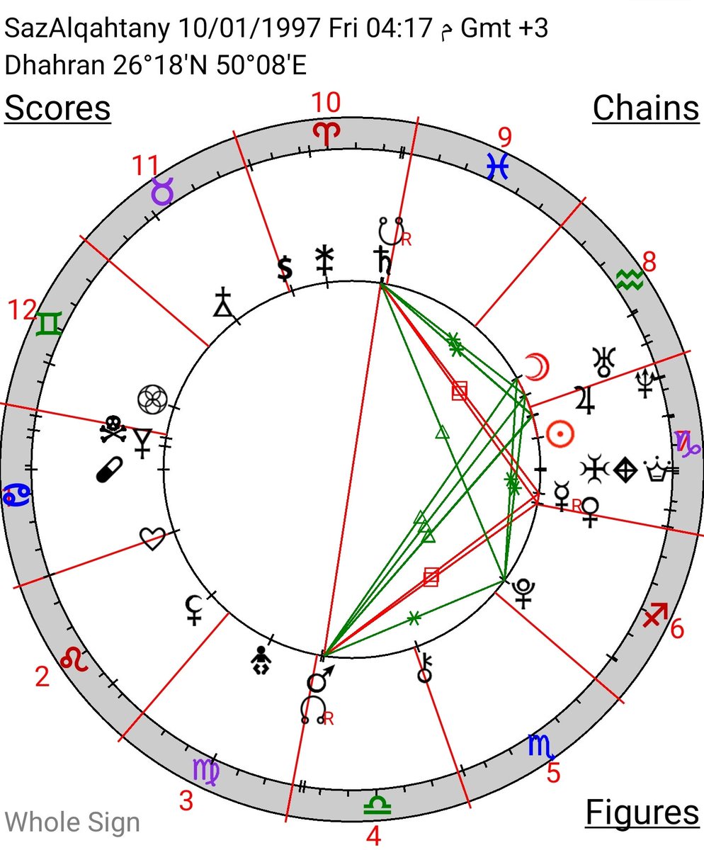 ساعة الولادة غير معروفة ،حطيتها طالع السرطان بالتقريب بحيث يكون الدلو هو الثامن وعبور كوكب سلبي فيه دلالة الوفاة ، ولكن كان لابد من وجود دلالة الوفاة في حادث سير او على الطريق أو صدمة أو بحريق وخنق وكل ذي الأشياء ما أدخل في تفاصيلها ، لأنه من سياستي عدم التطرق لموضوع الموت