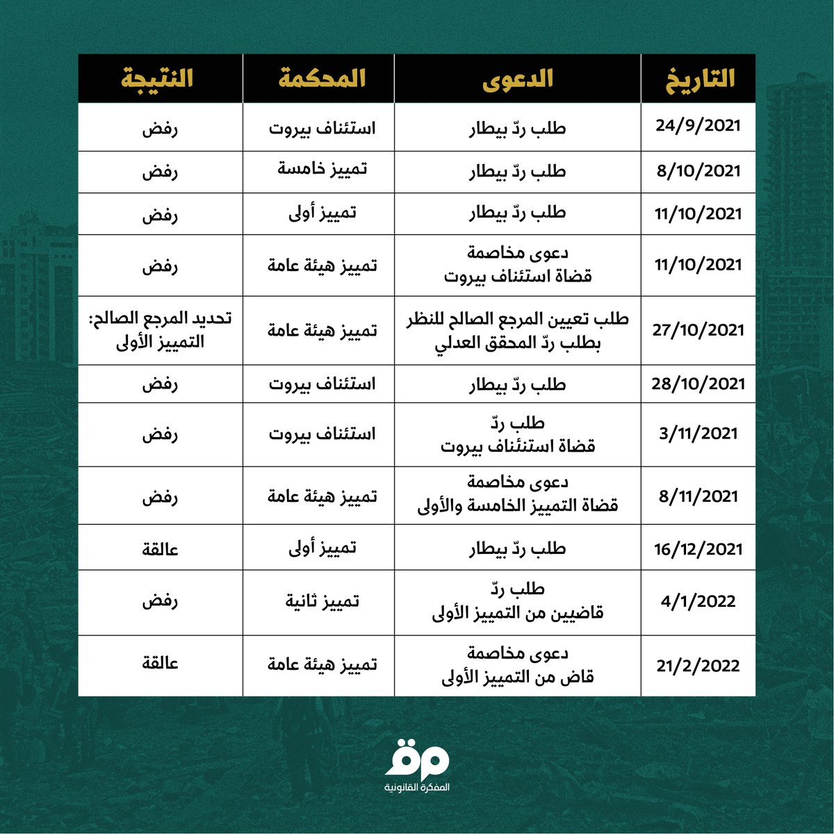 هدفت الدعاوى إلى كفّ يد المحقق العدلي طارق بيطار والقضاة الناظرين بطلبات كفّ يده. وقد أدّت الدعاوى الأخيرة إلى تجميد التحقيق منذ 23/12/2021 من دون أفق لعودته نتيجة الشغور في الهيئة العامّة لمحكمة التمييز.