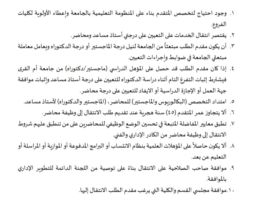 - يشترط عمر 45 ( هجري) للمتقدم على طلب تحويل لوظيفة محاضر. ولا يحدد عمر لوظيفة استاذ مساعد عند التحويل.