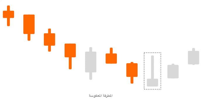 6- لدى نمط المطرقة أيضًا نسخة مقلوبة، والتي تتشكل أيضًا في ترند هابط وتشير إلى دعم السعر أو انعكاس محتمل للاتجاه. الفرق الرئيسي بين كل من الشمعتين هو في الواقع أن المطرقة المقلوبة لديها فتيل أطول (الظل العلوي).