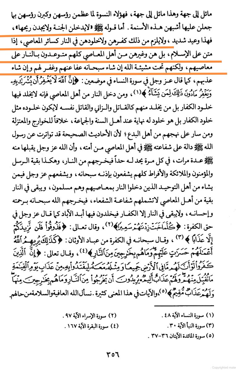 ولا يلزم من ذلك خلودهن في النار كسائر المعاصي إذا متن على الإسلام ولكنهم تحت مشية الله