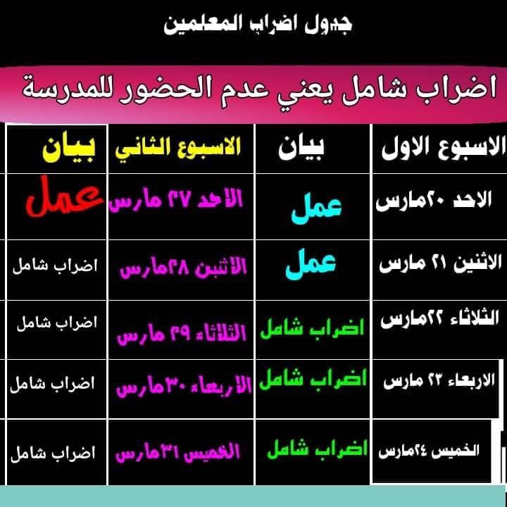 - بموجب الجدول اعلاه ووفق الإضراب الشامل يمتنع المعلمون عن الحضور لمدارسهم