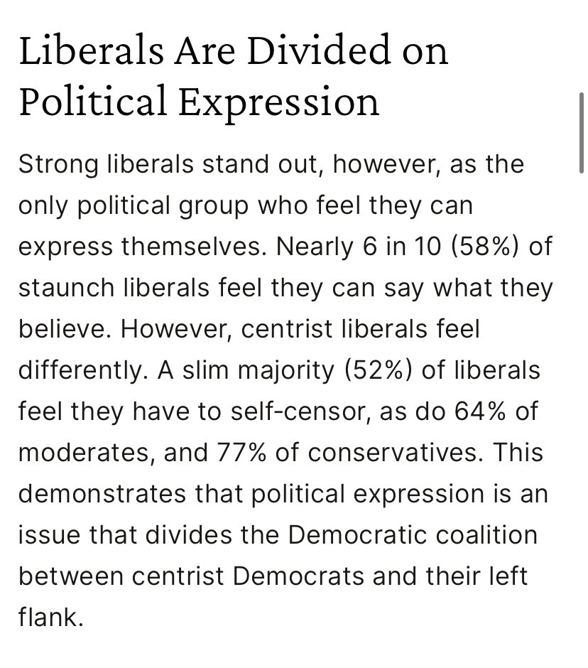The same survey found that only one political tribe had a majority of people who felt they could comfortably express themselves: strong liberals.