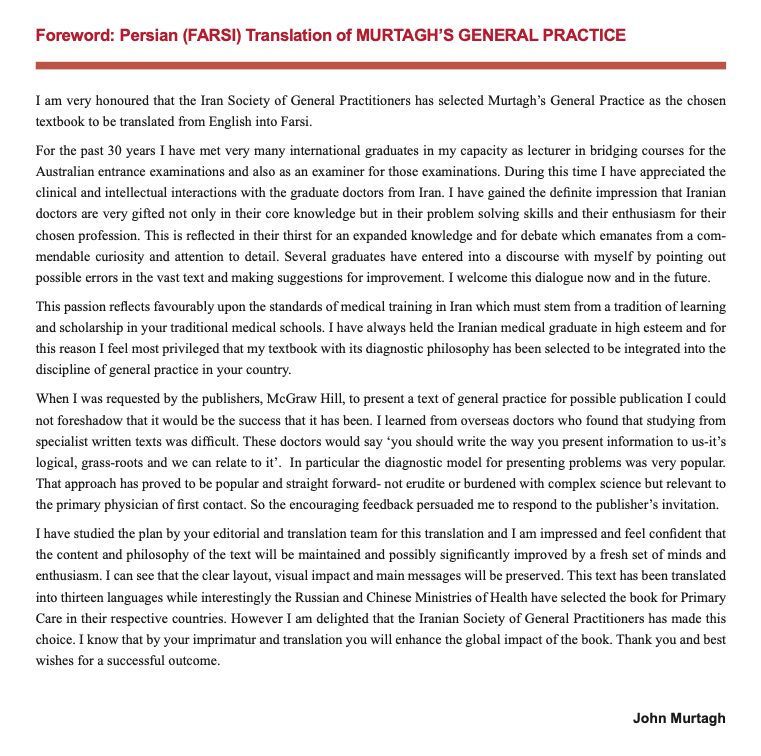 ترجمه فارسی در ۴۴۰ صفحه سال۱۳۹۶ منتشر شد. این کتاب به عنوان رفرنس طلایی و استاندارد طب عمومی در برخی کشورها مانند استرالیا و چین شناخته شده است. کتاب مورتاگ با حمایت انجمن پزشکان عمومی ایران و طی قراردادی رسمی با انتشارات McGraw Hill منتشر شد.