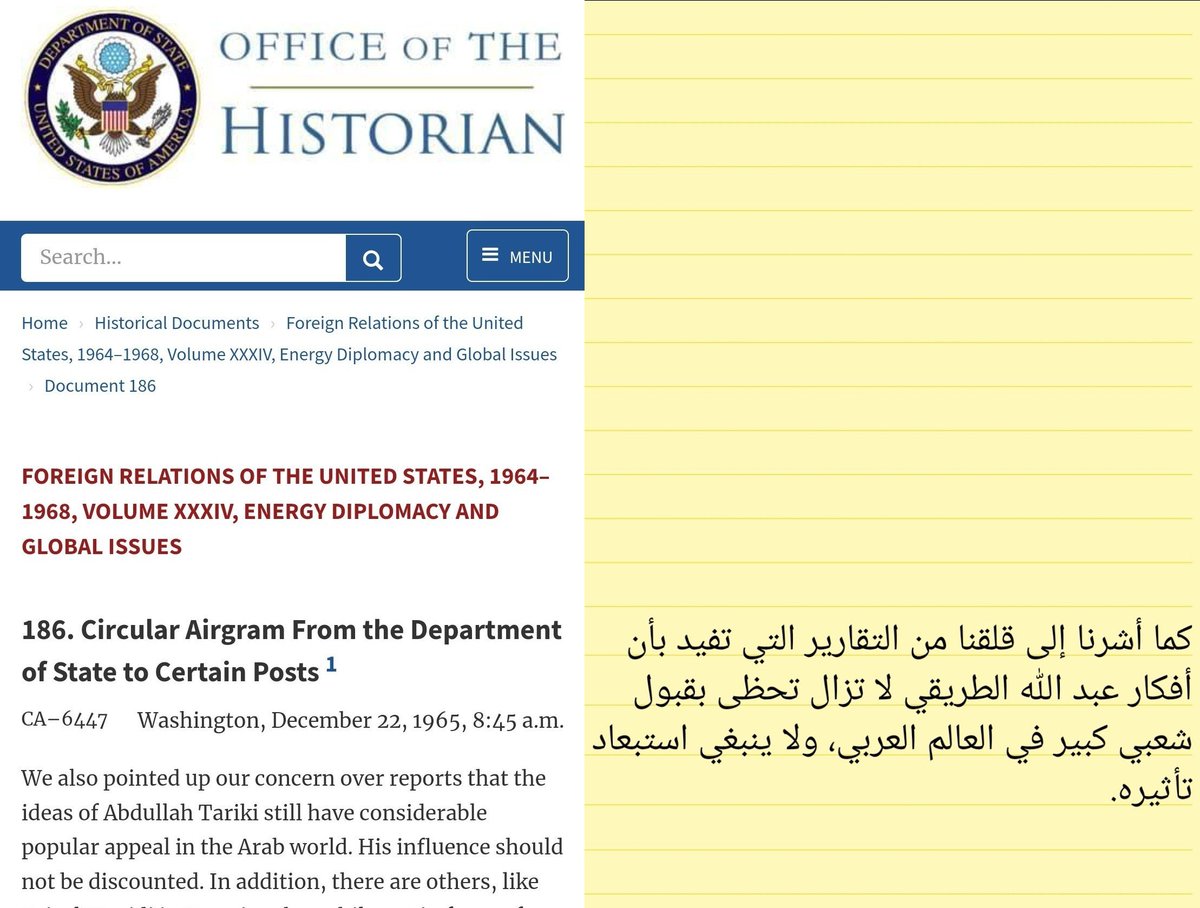 39- حتى بعد خروجه من الوزارة، كان #الشيخ_عبدالله_الطريقي يشكل قلقًا على شركات النفط الأمريكية بسبب فكره وآرائه، لذا نشرت وزارة الخارجية الأمريكية تقريرا داخليا عام 1965م ذكرت فيه ان أفكار عبدالله الطريقي لا تزال تحظى بقبول شعبي كبير في العالم العربي، ولا ينبغي استبعاد تأثيره!