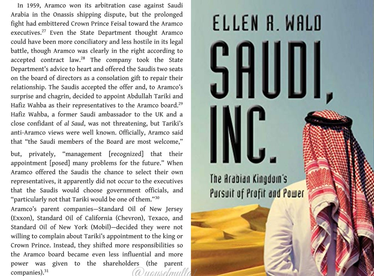 23- لكن ظلت المناقشات المتعلقة بمشاركة سعوديين في مجلس الإدارة بين أخذ ورد لسنوات، حتى انتهت عام 1959م عندما طلبت الشركة من الحكومة السعودية ترشيح اثنين من السعوديين للانضمام إلى المجلس، فاختارت الحكومة #الشيخ_عبدالله_الطريقي وحافظ وهبة السفير السعودي السابق في لندن.