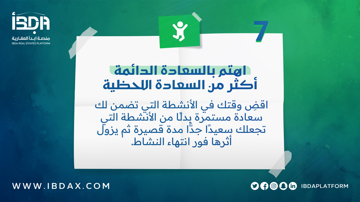 اقضِ وقتك في الأنشطة التي تضمن لك #سعادة مستمرة بدلًا من الأنشطة التي تجعلك سعيدًا جدًّا مدة قصيرة ثم يزول أثرها فور انتهاء النشاط.