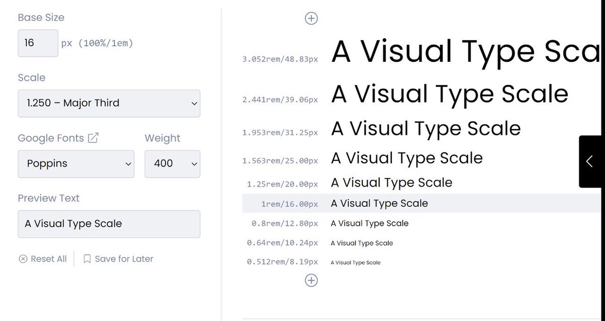 هذا الموقع يساعدك في تحديد حجم الخط للعنواين في التصميم وتقدر تحدد كم مقدار الزيادة بين أحجام الخطوط للعناوين وهو بحسبها لمستويات العنواين الأخرى