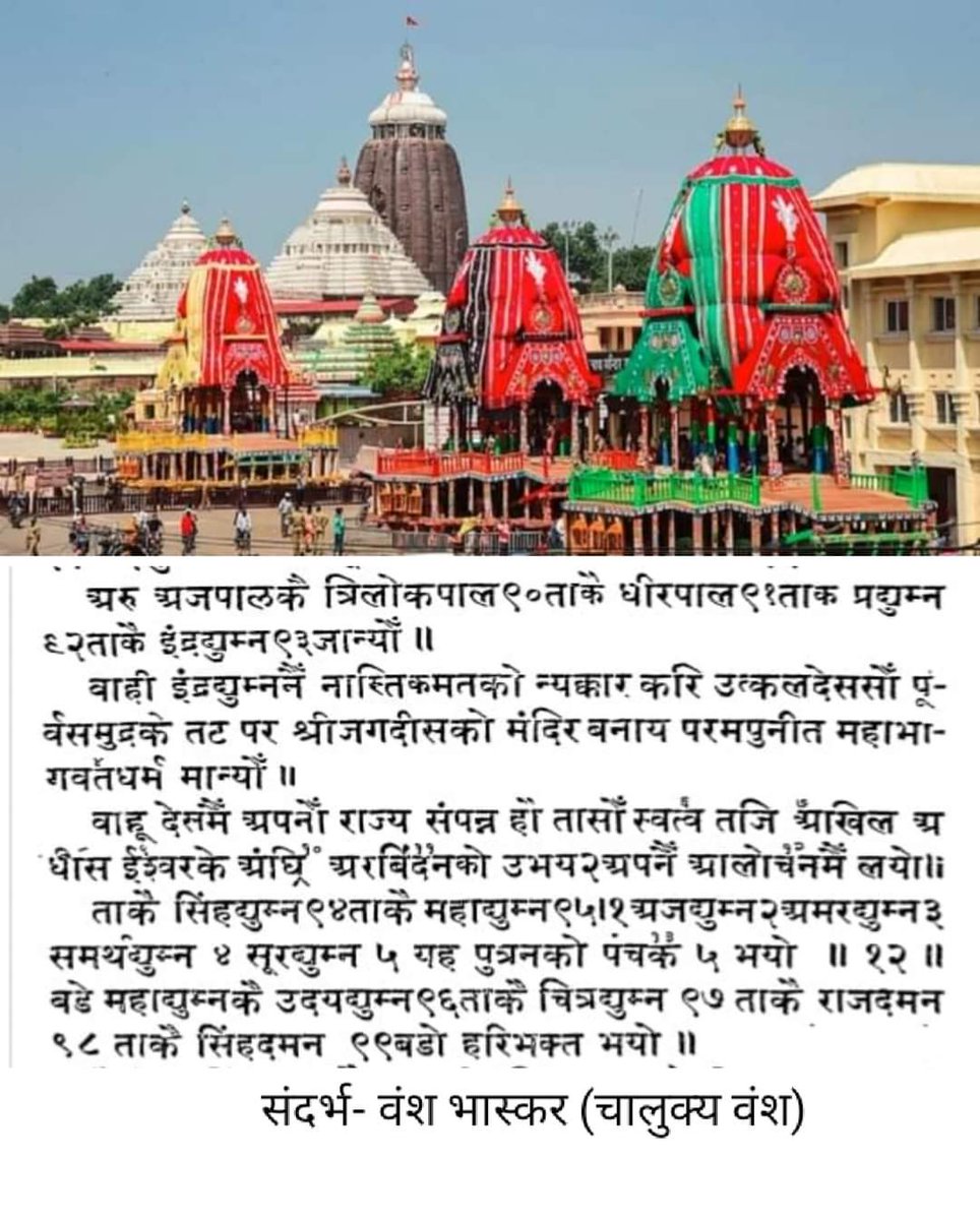 चालुक्य इंद्रद्युम्ननैं नास्तिकमतको न्यक्कार करि उत्कलदेससौँ पूं र्वसमुद्र के तट पर श्रीजगदीसको मंदिर बनाय परमपुनीत महाभा गवतधर्म मान्योँ ॥ वाहू देसमैं अपनों राज्य संपन्न हो तासाँ स्वत्व तजि अखिल अ धीस ईश्वर के अंधू अरबिंदनको उभयपनँ आलोचनमैं लयो । ..[2]