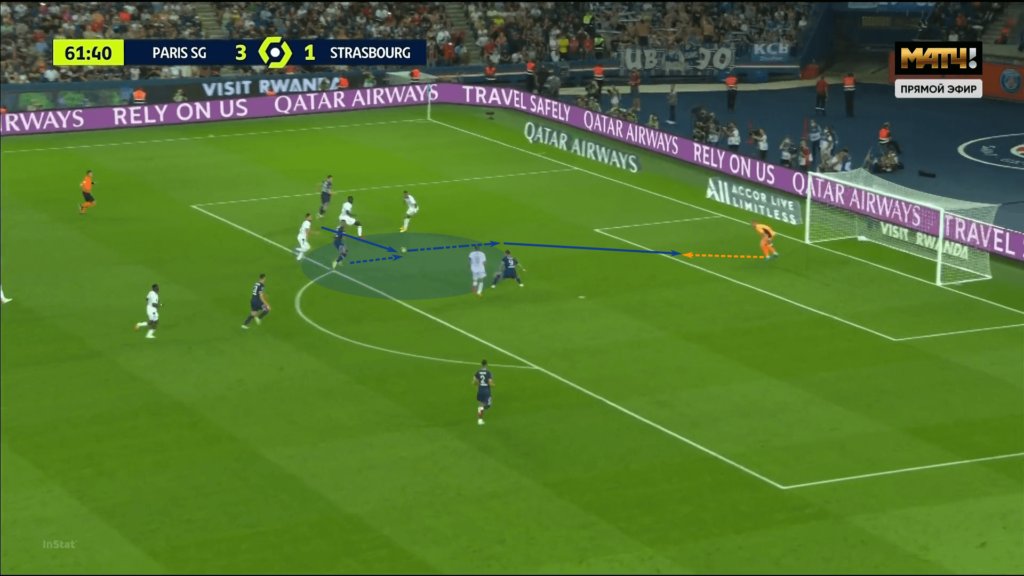 أخيرًا ، هناك استمرار في مسيرته مع العلم أن مراوغته الأولية وتمريره قد أزاحا 3 لاعبين من وسط الملعب مع احتلال العضو الوحيد المتبقي من خط الدفاع إيكاردي. في هذا التسلسل ، يمتد مبابي عرض الملعب ليخلق ممرًا خاصًا به للركض مركزيًا. إنها حركة رائعة ومنسقة بشكل جيد من قبل الفرنسي.
