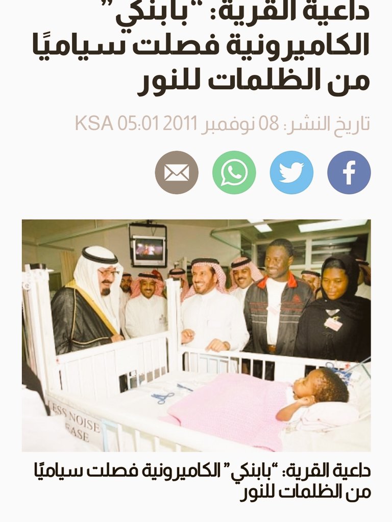 76. ذكر لي الشيخ أحمد السلامة @ahmadalsalamah1 المدير السابق لمركز خادم الحرمين الشريفين في ياوندي، كيف أثّر توجيه الملك عبدالله رحمه الله بفصل السياميين الكاميرونيين على الشعب هنا، وكيف تسبب هذا الموقف الإنساني في إسلام أكثر من ألفيْ كاميروني بما فيهم أحد السلاطين.
