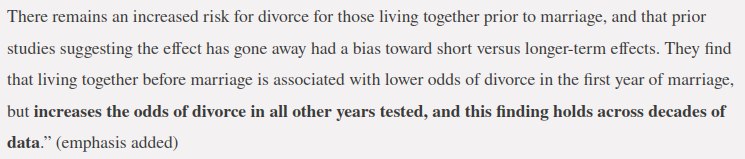 بانخفاض احتمالات الطلاق في السنة الأولى من الزواج ، لكنه يزيد من احتمالات الطلاق في السنوات التي تليها ، وهذه النتيجة من خلال الكثير من البيانات ".