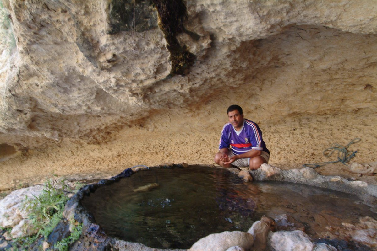 عندما وصلنا إلى العين الأولى ، لاحظنا تساقط قطرات المياه من الجبل من خلال فتحات ضيقة جدا
