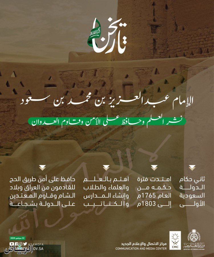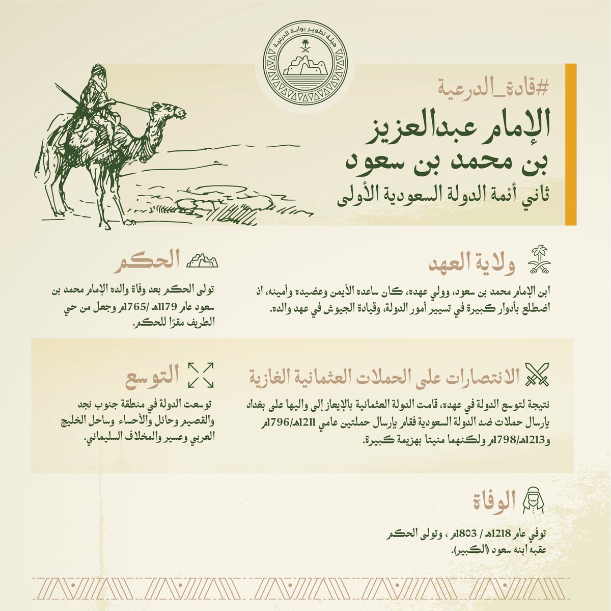 2️⃣ في سنة ١١٧٩ هـ انتقل والده محمدبن سعود إلي جوار ربه رحمه الله تعالى فقدمه شيخ الإسلام لمبايعة الناس لما يعلم من كفاءته على أن عبدالعزيز لم يخرج عن مشورة شيخه ووالده في أمور الدولة العسكرية وغيرهاوقد تولي الأمر وهو في ٤٥ من عمره وأتسع نطاق الدولة في عهده اتساعاً كبيراً