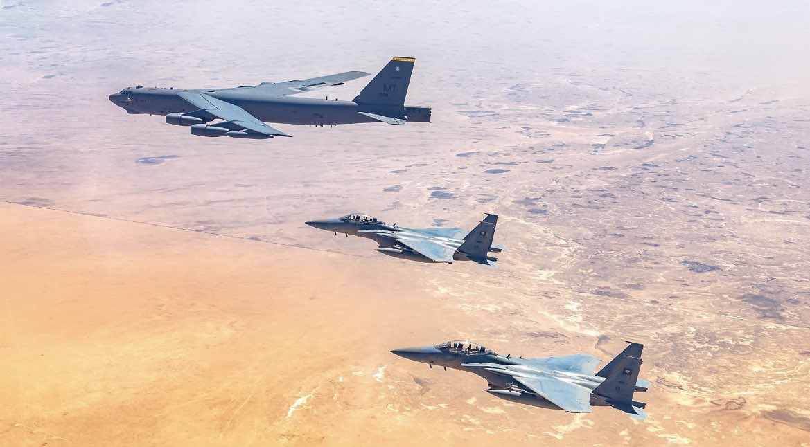 طائرات مقاتلة سعودية من طراز F-15 ترافق القاذفة الأمريكية B-52 أثناء عبورها أجواء السعودية.🇸🇦🇺🇸