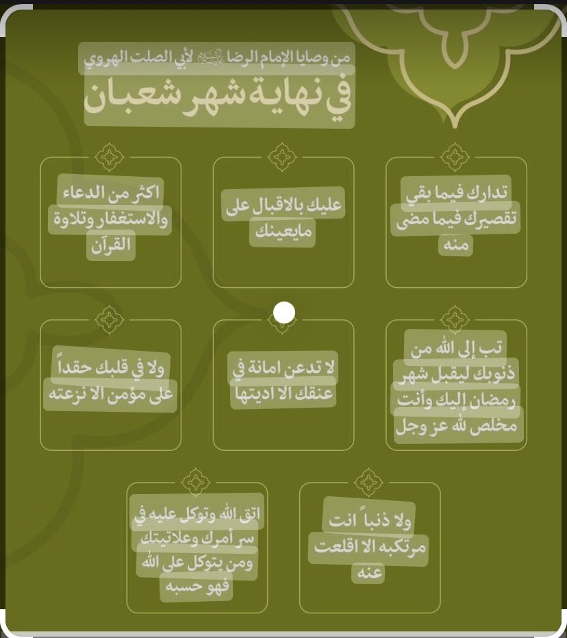 وأكثر من الدعاء والاستغفار وتلاوة القرآن وتب الى الله من ذنوبك ليقبل شهر رمضان إليك وأنت مخلص لله عزّ وجلّ، ولا تدعنّ أمانة في عنقك إلاّ أدّيتها ولا في قلبك حقداً على مؤمن إلاّ نزعته ولاذنباً أنت مرتكبه إلاّ اقلعت عنه 👇