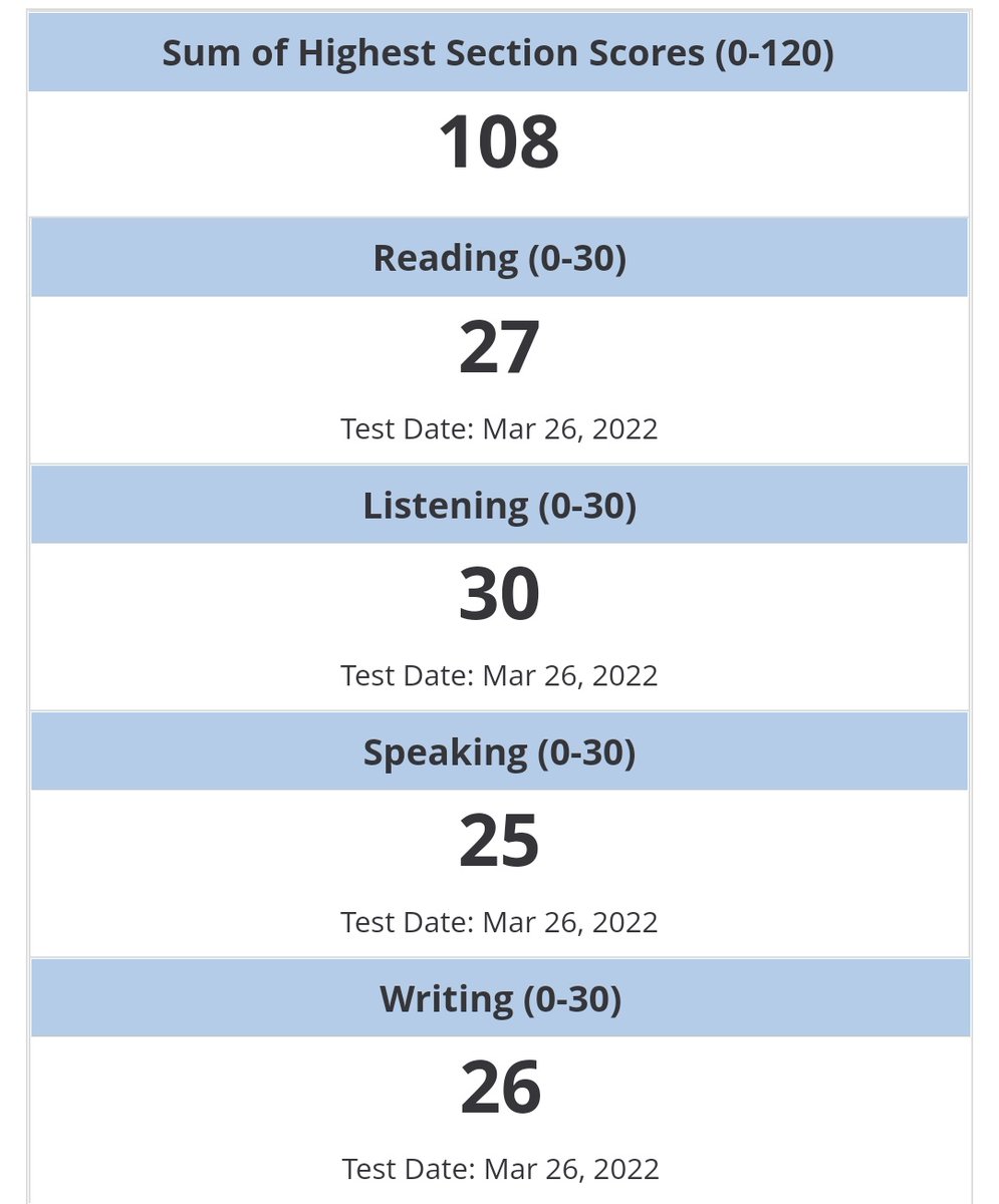 صباح الخير انا مؤخرا امتحنت TOEFL Ibt وكنت مقررة لو السكور طلع كويس هشارك تجربتي عشان لو ممكن تفيد حد تاني الحمد لله جيبت 108/120 فحاسة تجربتي ممكن تكون مفيدة.
