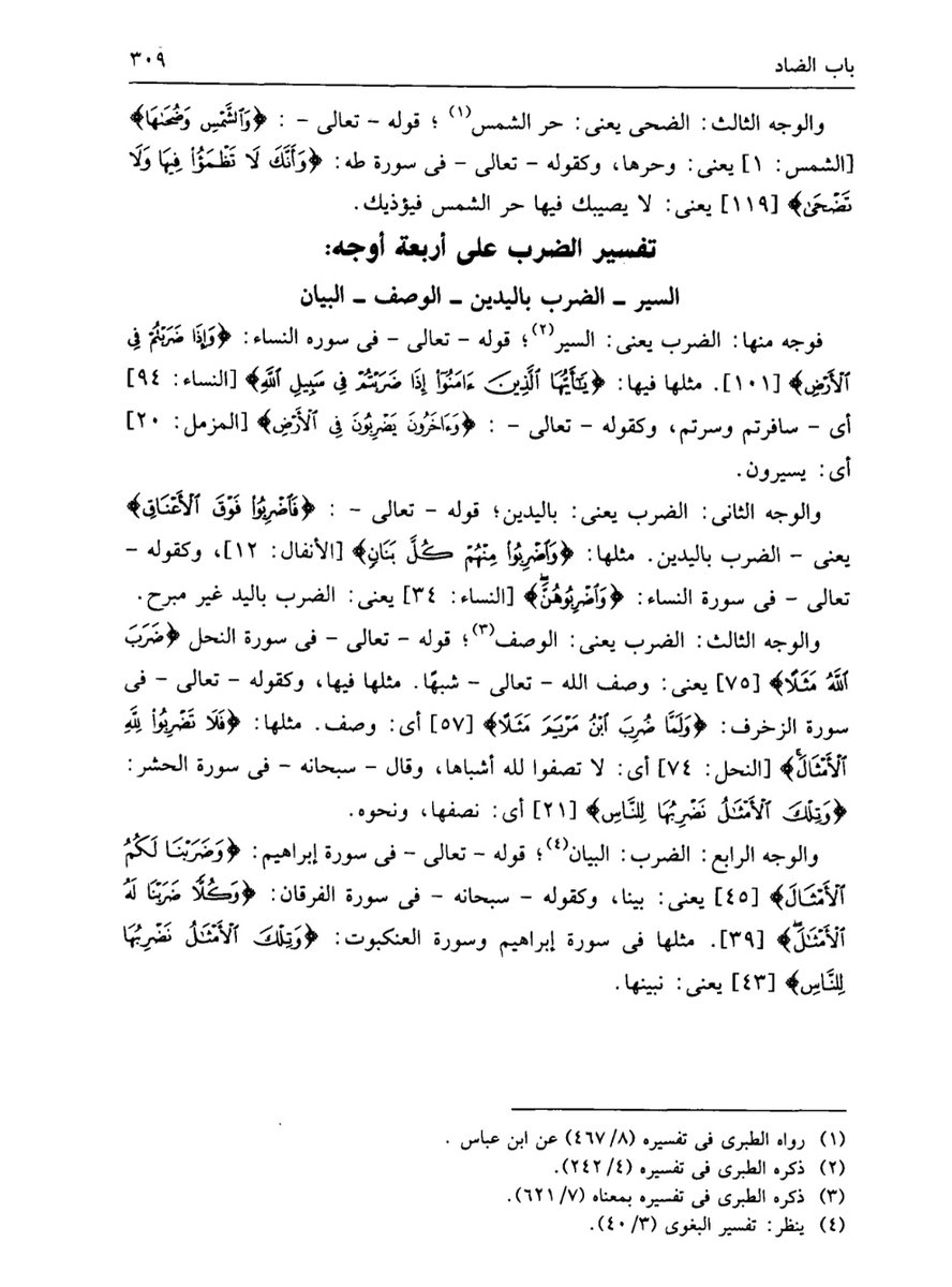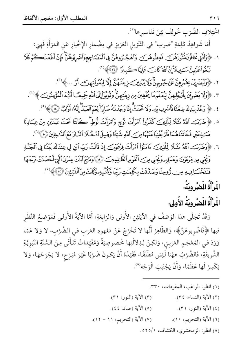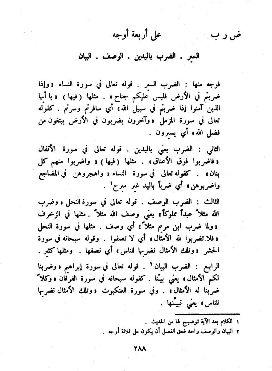 الأصل في الضرب الجلد بالسوط وما أشبهه ثم نقل بالاستعارة إلى مواضع فيقال ضرب في الأرض...إلخ الضرب في القرآن على ثلاثة أوجه الثاني الضرب باليد وبالآلة المستعملة باليد ومنه قوله تعالى ( واضربوهن )