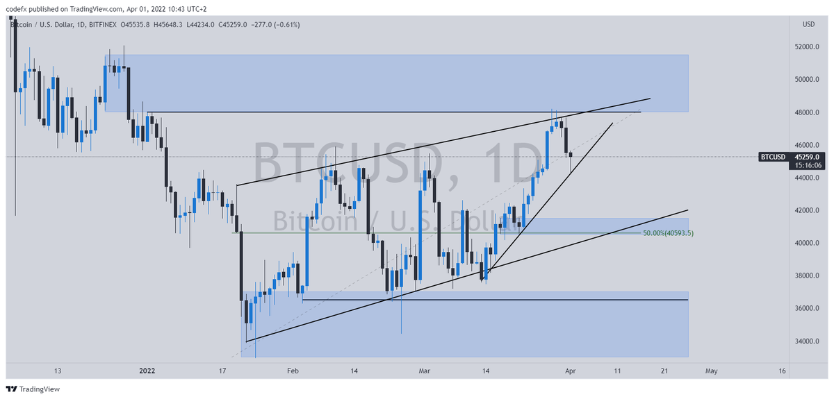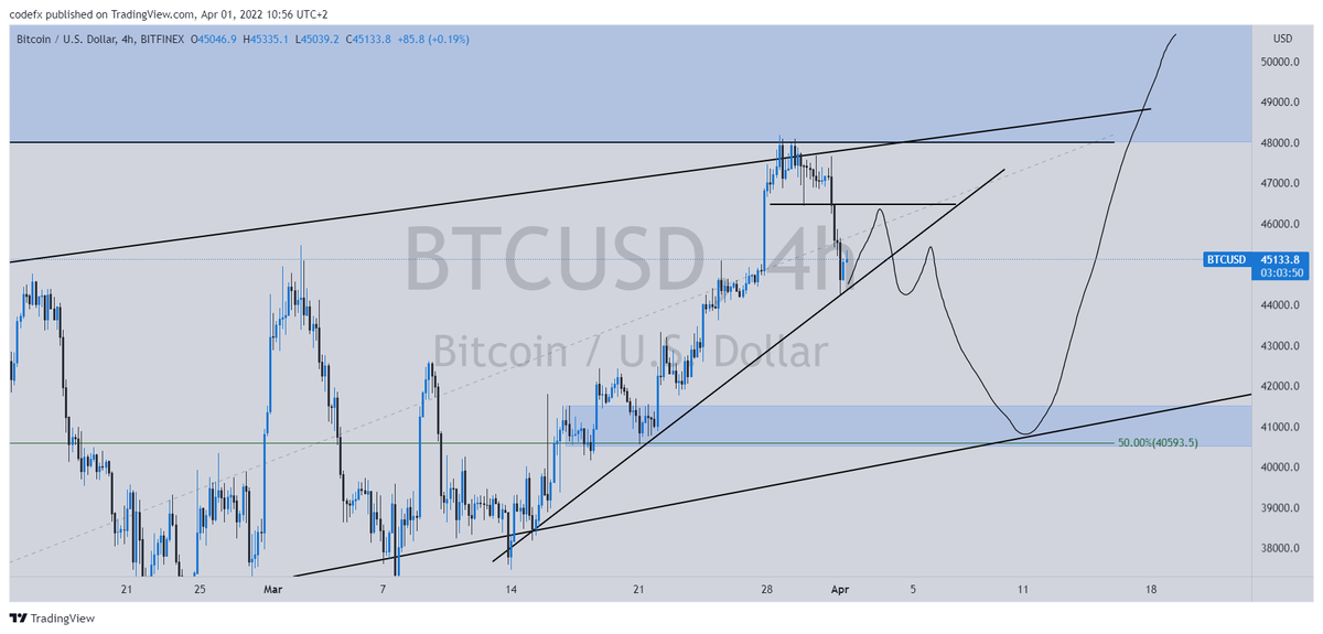 En mi opinión, la corrección hasta los 44.000$ es magnífica y puede ser suficiente, pero hay que tener más escenarios planificados y más aún sabiendo que teóricamente puede ir en busca de la parte baja del canal