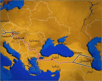 لتمر كل هذه الأنابيب من الشرق إلى مدينة «تبليسي» في جورجيا ثم تتلاقى بخطوط أنابيب أخرى قادمة من قطر واسرائيل ولبنان لتتلاقي جميع الخطوط في «تركيا» لتصبح هي «عقدة الغاز» برضه في المشروع الجديد واللي منها بيتم توزيع خطوط الأنابيب على باقي دول أوروبا👇