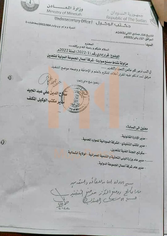 وجاء قرار إعادة الشركة بتوصية من مبارك أردول مدير الشركة السودانية للموارد المعدنية التي من المفترض ان تكون مهمتها الأساسية حماية البيئة و الانسان من مخاطر التعدين في المجتمع المحلي...