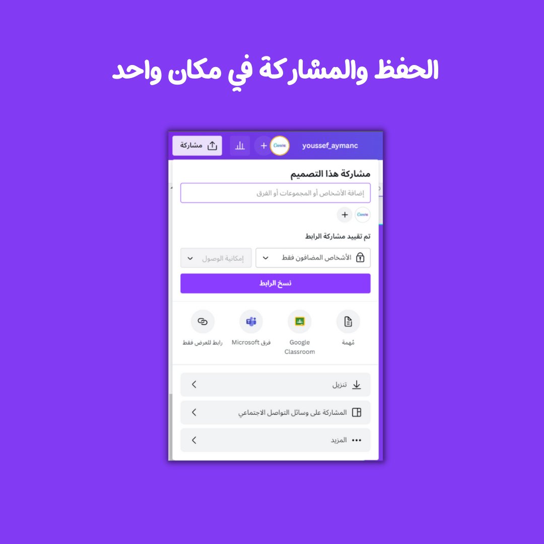 الآن كانفا خلت حفظ التصاميم ومشاركة التصاميم في مكان واحد،رغم اني صراحة مش حاب هذه الاضافة لانه هتخليني اضغط على المشاركة في كل مرة بدي احفظ التصميم ✨