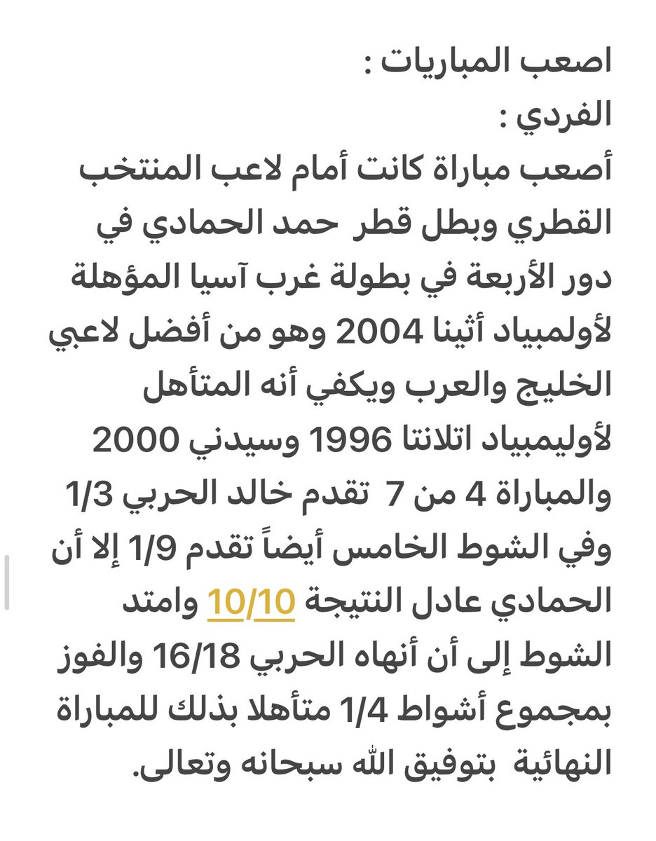 ⁃ المركز الثالث لفردي الرجال في البطولة العربية بقطر 2011 بعد لاعبي مصر سيد لاشين وعمر عصر