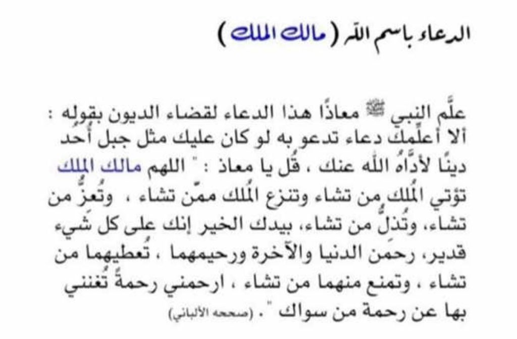 -اللهم مالك الملك تؤتي الملك من تشاء وتنزع الملك ممن تشاء وتعز من تشاء وتذل من تشاء بيدك الخير إنك على كل شيء قدير.