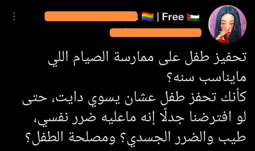 هل أصبحتِ الآن تخافين على الأطفال وتريدين مصلحتهم، طيّب بخصوص عَلَم الشّىذوذ الذي تضعينه في حسابك، ما هي المصلحة في أن يطأ الرجل رجلًا آخر غير الأمىراض والغثىيان وإشباع رغىبات منحىرفة ومخىالفة للفطرة؟