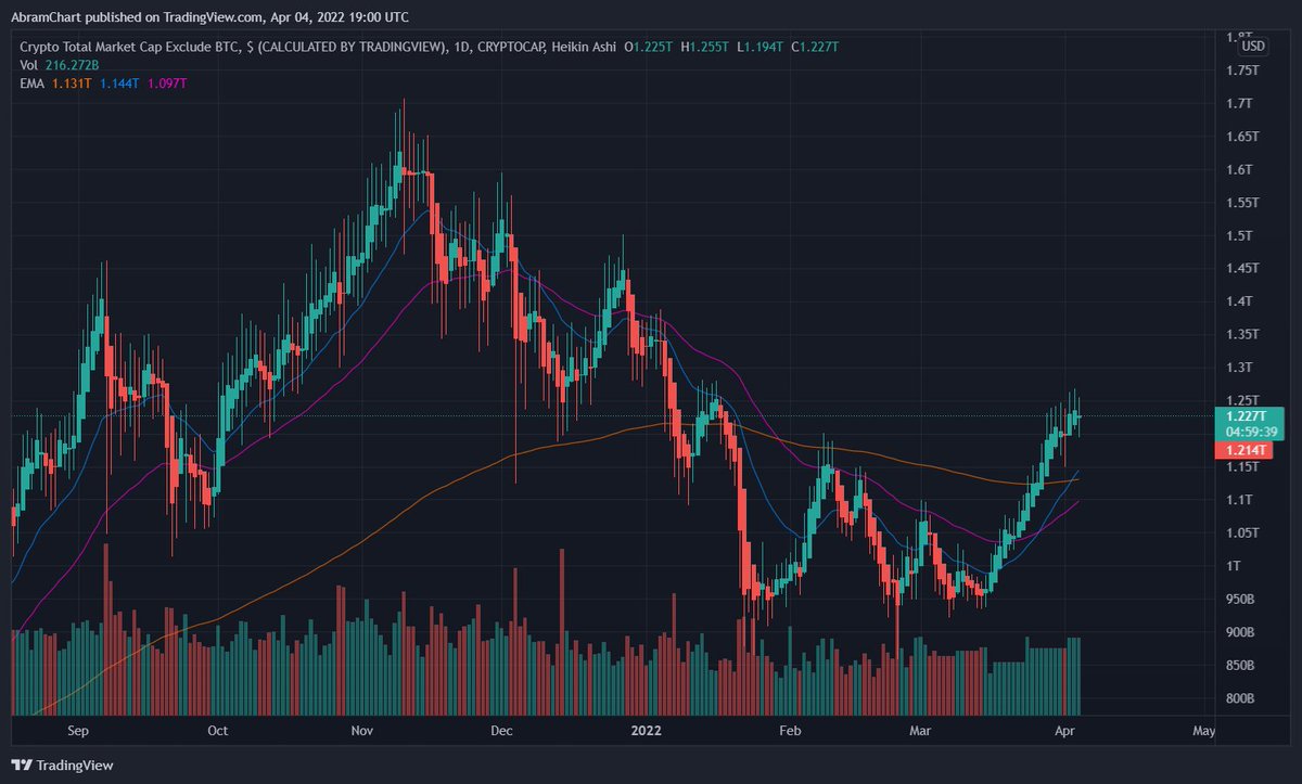 يعطيك القيمة الاجمالية للسوق كله العملات البديلة والبتكوين بالدولار ويمكنك وضع الدعوم والمقاومات واستخدام المؤشرات عليه