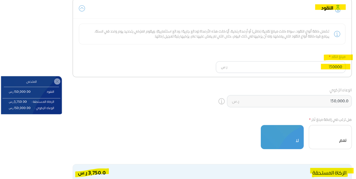 طريقة احتساب #زكاة_النقود أو الكاش من نفس الرابط نختار ايقونة النقود ونضع المبلغ المراد دفعة زكاته حسب المثال 150 ألف ريال ومن ثم تظهر النتيجة كما في المربع الأزرق بـ 3750 ريال ..