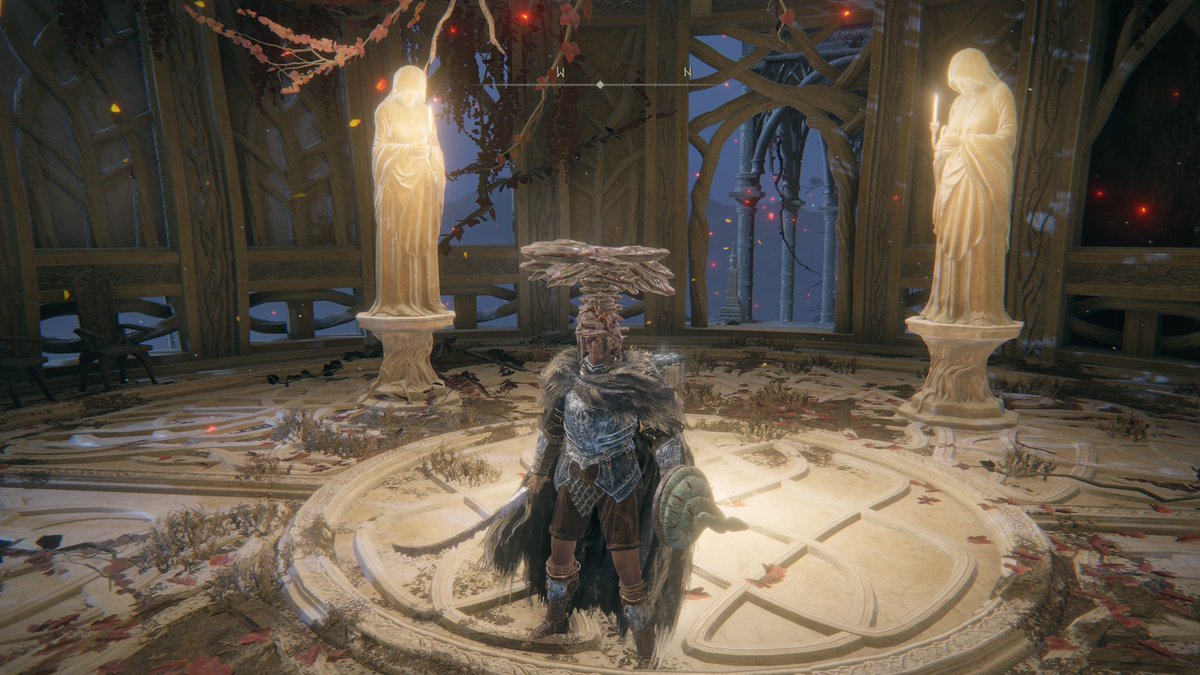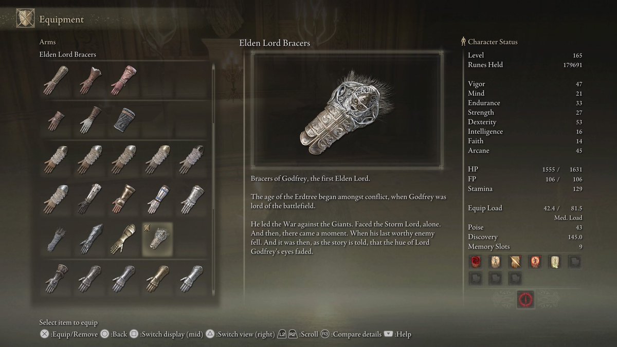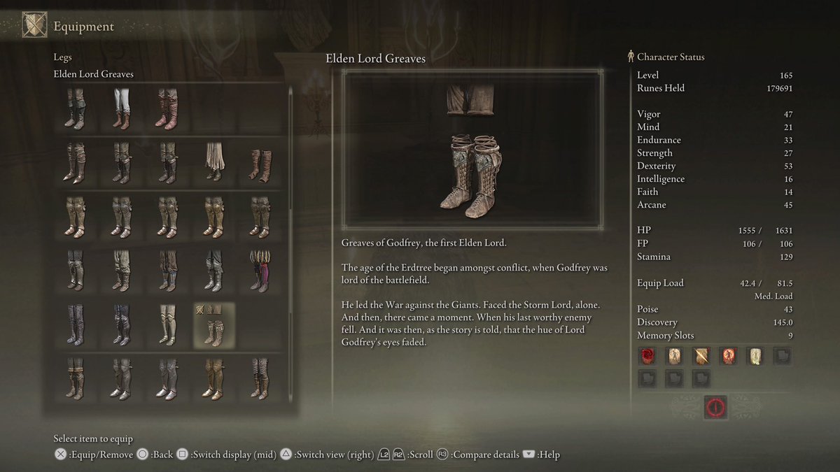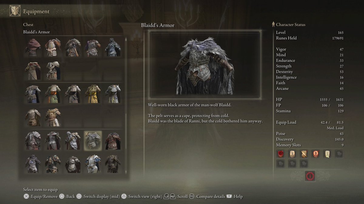 اما باقي الدروع كنت ابدل بينها وتقريبا استقريت على Blaidd's Armor للصدر، و Elden Lord لليد والقدم.