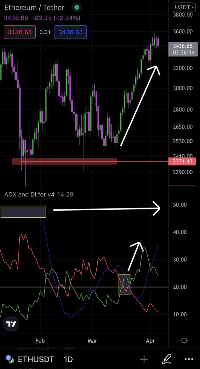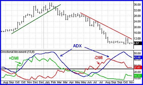 1-ADX يقيس مدى قوة الاتجاه بغض النظر إذا كان هذا الاتجاه صاعد أو هابط (الخط الأزرق )