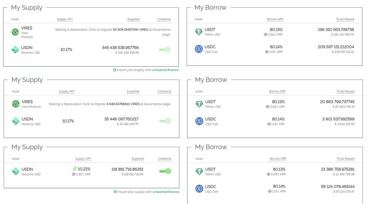 Vamos a verlo con la cuenta de 545M USDN. Tiene como préstamo 196M USDT y 209,6M USDC.