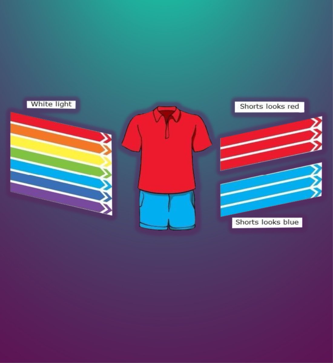 إذن إن الضوء المنعكس هو ما نراه بأعيننا، لذلك الأشياء ذات اللون الأبيض سمحت بمرور كل الأطوال الموجية مما أظهر لنا اللون الأبيض، بينما الأشياء ذات اللون الأسود امتصت جميع الأطوال الموجية ولم تسمح بمرور أي طول موجي وبهذا ظهر لنا اللون الأسود.