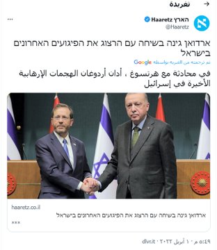 قيادي ستقوم أنت أيضًا بزيارتِه يعني أن آردوغان سيزُور تل آبيب في وقت قريب بطبعها كيان صديق وتربطه مصالح معها ،الضحية من الخريف العربي هي الشعُوب العربية التي كانت كبش فِداء بين التقتيل والترويع وتدمير بُنيتها التحتية التي بالأساس هي بُنية هشة مع إرجاع الأقطار العربية من سوريا