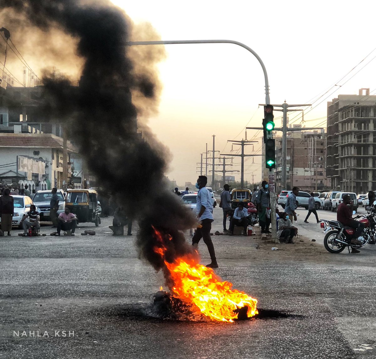 دخاخين لساتك محروقة، هتافات، اغاني، رجال في كراسي تحت ظلال الاشجار في الصحافة، أو اركويت، على جانبي الطريق، المشوار طويل، ام يطول؟