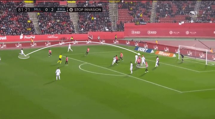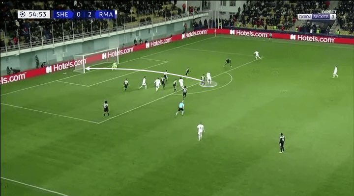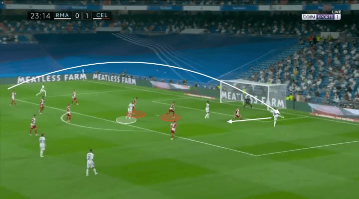 في حين أن جميع المدافعين قاموا بتتبع الكرة فوق رؤوسهم ، فقد تعمقوا لحماية المساحة أمام خط الستة. وأدرك بنزيما أنه لا يوجد أي لاعب خط وسط ، لا يوجد أحد في تلك المنطقة.