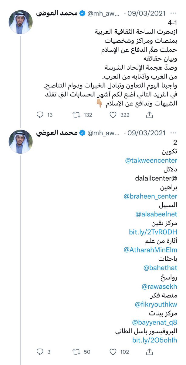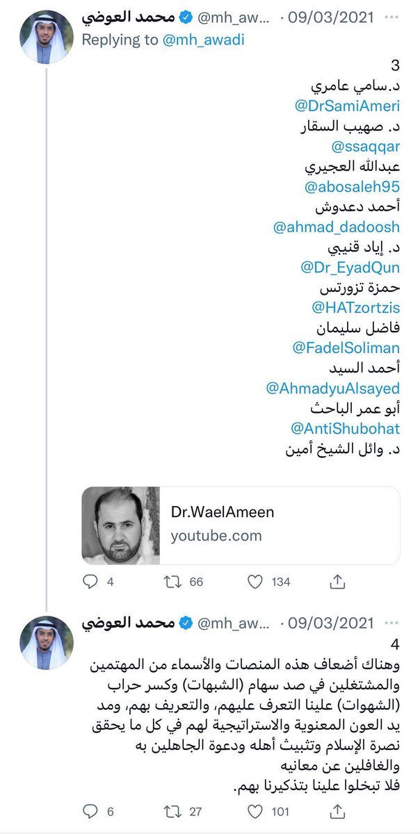 وهنا تجدون عينة من العلماء الذين يراهم العوضي كباراً في الرد على شبهات الإلحاد. ولاحظوا خلو القائمة من العلماء المعتبرين سواء في المملكة أو خارجها. وإني أحذركم من أغلب من ورد اسمه في هذه القائمة وخصوصاً المدعو أحمد دعدوش @ahmad_dadoosh الذي يحقد على حكام وعلماء المملكة.